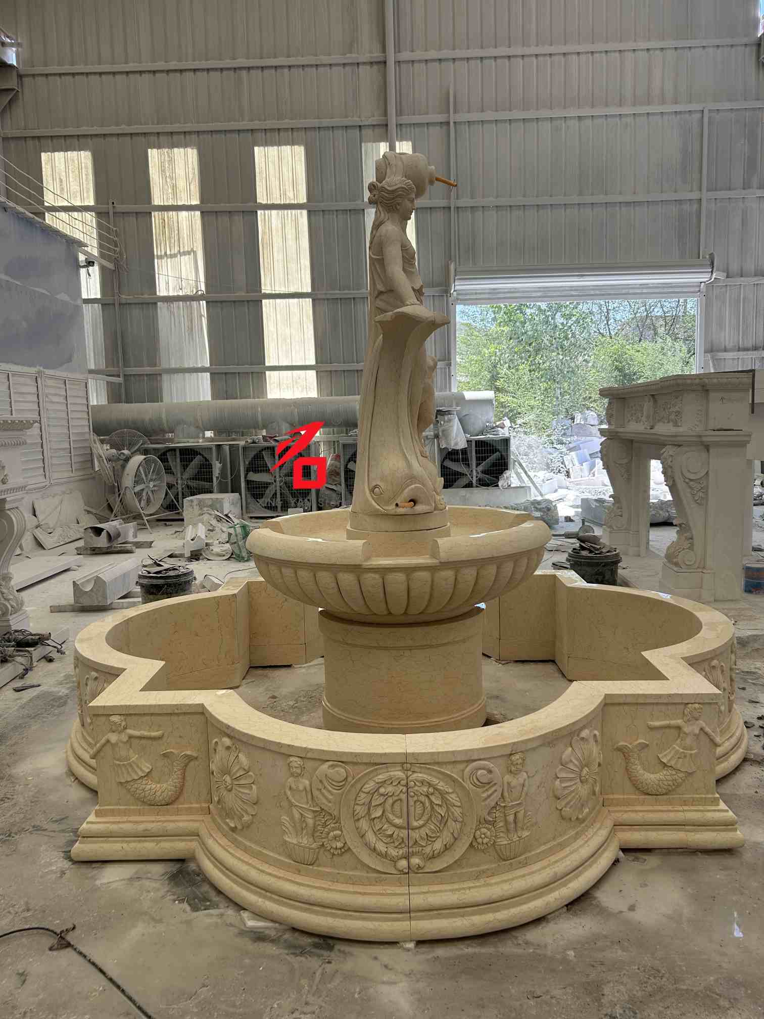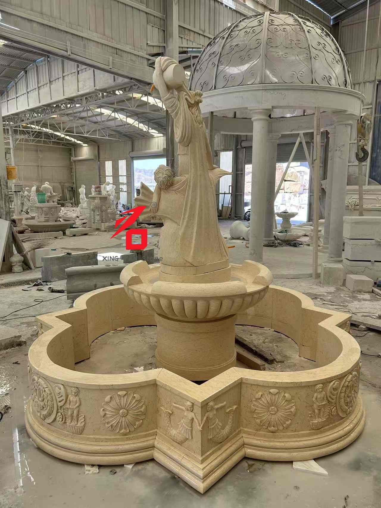 خيارات الحجر: تشمل خيارات الحجر المخصصة الرخام البيج والرخام الأبيض والحجر الرملي والأحجار الطبيعية الأخرى. يضمن الملمس الناعم للحجر ولونه الدافئ ومقاومته القوية للعوامل الجوية متانة النافورة وجاذبيتها الجمالية للاستخدام الخارجي طويل الأمد. حرفية النحت: باستخدام تقنيات النحت اليدوية التقليدية، يقوم النحاتون ذوو الخبرة بصياغة كل التفاصيل بدقة، بدءًا من تعبيرات وجه الإلهة والستائر وحتى الزخارف على شكل الطفل والسمكة، مما يعرض الملمس الفني والأبعاد الثلاثية للنحت الكلاسيكي الأوروبي.